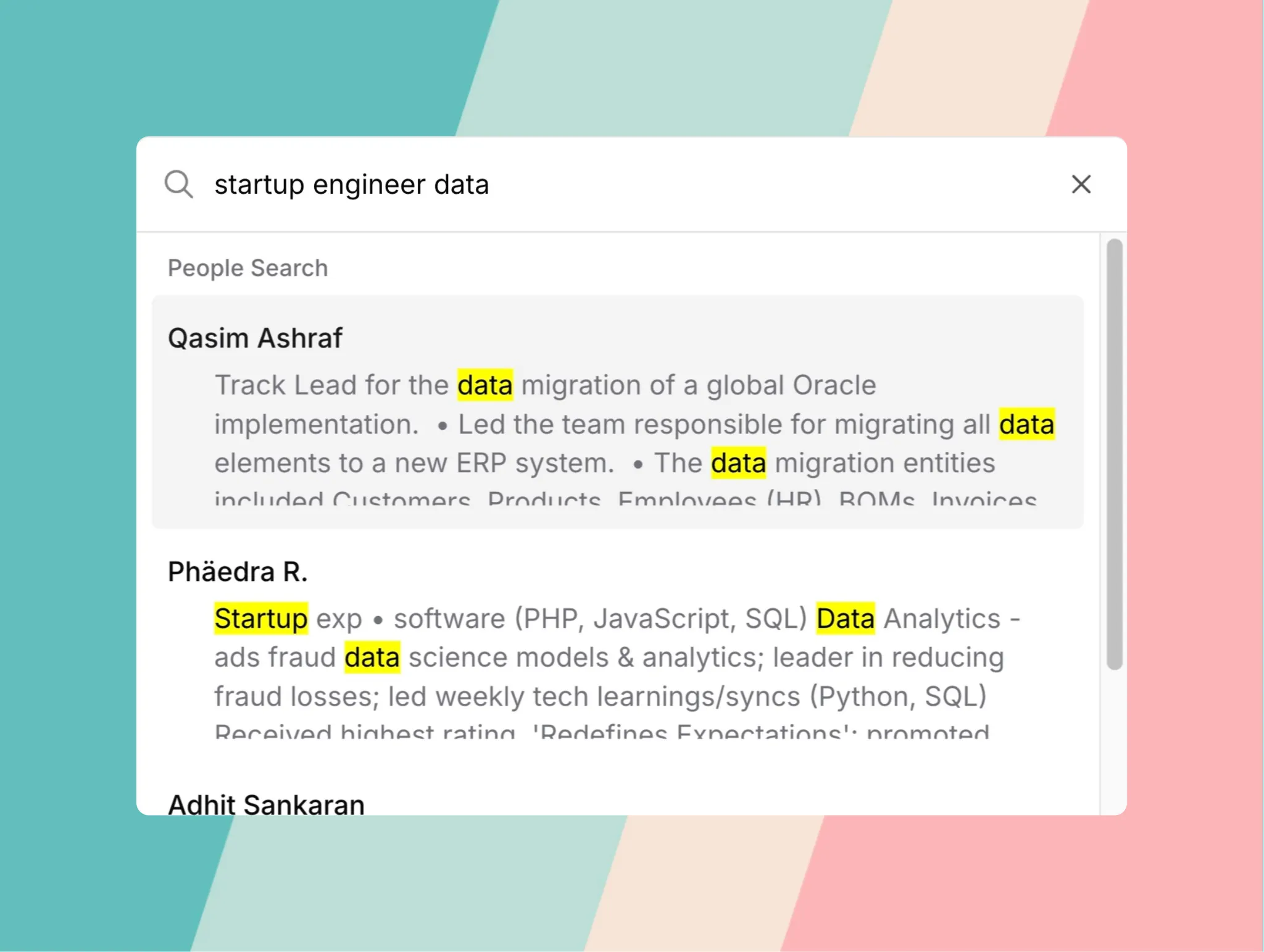 Search across all people extremely fast - Now leverage a state of the art search engine to instantly search through all your candidate data, including tags, work experience, notes and more. We ll this further with AI-powered semantic search so that you locate the perfect candidate even if they don’t exactly match your search terms
